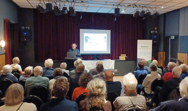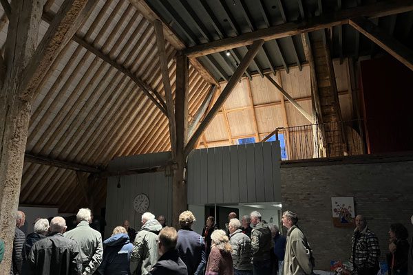 Vervolgens was het tijd voor de koffie met oranjekoek in het Parochiehuis. Na de koffie nam Gerard Brouwer, ons bestuurslid, het woord. Hij geeft uitleg hoe de Plan van Aanpak verloopt bij dit soort grote projecten. Wat wil de eigenaar en wat is er mogelijk, met als scherprechter het budget? Bij deze boerderij moest het gehele dak eraf. Doel was om met lichtstroken voldoende daglicht in de leefruimte te verkrijgen. Hiervan zijn in de provincie vele voorbeelden te vinden. En, belangrijk; hoe krijg je toestemming van de gemeente? En reken er maar op dat niet alleen Welstand maar ook nog Amersfoort (Monumentenafdeling van het Rijk, RCE) er een mening over heeft. Uiteindelijk moeten de bewoners er dagelijks in leven en kunnen genieten van het resultaat. Hier is ernaar gestreefd om het glas niet op de pannen maar lager aan te brengen, om geen lelijke puisten op het dakvlak te krijgen zoals bij toepassing van Velux dakramen. Naast het daglicht via de lichtstroken in het dak is er ook daglicht en uitzicht verkregen via een insnoering van de langsgevel.