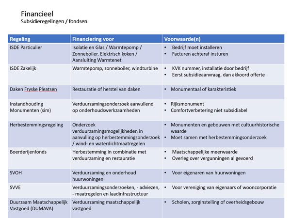 Naast dit project is ook een ander voorbeeldproject getoond van een kleinere boerderij met een rieten kap waar het principe ‘doos in doos’ is toegepast. In dat geval laat je de gevels, dak en vloer origineel en plaatst een goed geïsoleerde binnenruimte met een gang rondom in de schuur. Het blijft een kunst om voldoende daglicht in die doos te krijgen. Gerard laat diverse voorbeelden zien van details hoe je tot de juiste keuze komt. Vacuümglas, vochtschermen, biobased materialen, er zijn veel mogelijkheden. Maar ook de fouten die je kunt maken komen aan de orde. Telkens wordt de vraag gesteld: ‘hoe ga je de ruimte gebruiken, hoe zorgen we ervoor dat er geen vocht achter blijft waardoor rotting en schimmel kan ontstaan’. Als laatste kwam aan bod waar subsidies zijn te krijgen (zie ook onderaan).